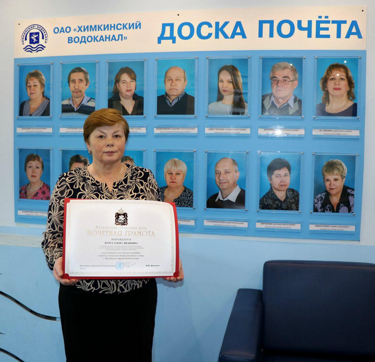 Для торжественного вручения наград за достижение высоких результатов в профессиональной деятельности были приглашены сотрудники ОАО "Химкинский водоканал" Булкин Игорь Владимирович слесарь аварийно-восстановительных работ 6 разряда службы водоснабжения и Фурса Елена Владимировна машинистка насосных установок 3 разряда службы эксплуатации насосных водопроводных станций.